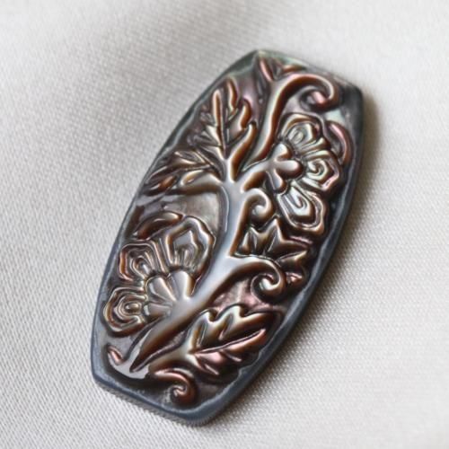 虹色のイリデッセンスと繊細な手彫り模様がとても綺麗なシェル・カボションです。